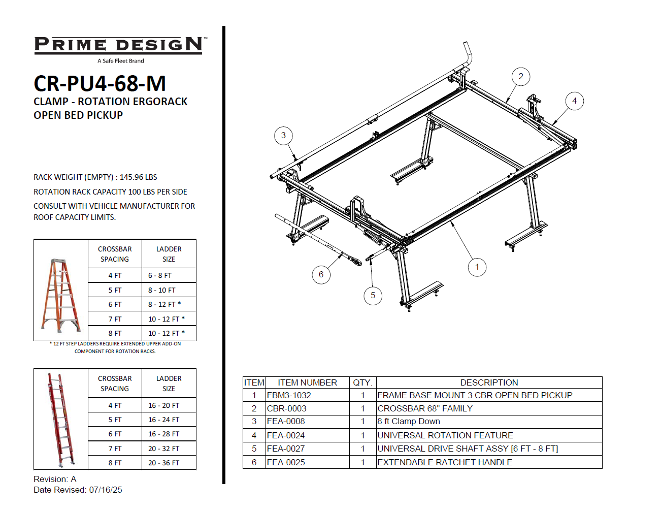 Prime Design NEXT GEN ErgoRack Single Side Drop-Down (Slide Rotation) and Clamp Ladder Rack (CR-PU4-68-M) for 6-8 Ft Full Size Open Bed Trucks